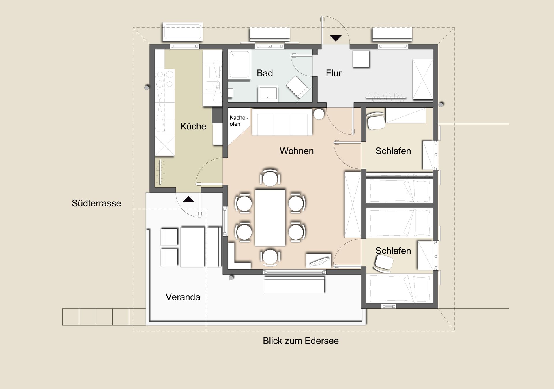 (20 m²) TV SAT/Kabel, Radio mit CD-Player, Kachel-Ofen, Schlafsofa, Esstisch, großes Panoramafenster mit Seeblick, Holz-Innenrollläden an den Fenstern, Bücherregal mit Büchern, Gesellschaftsspiele